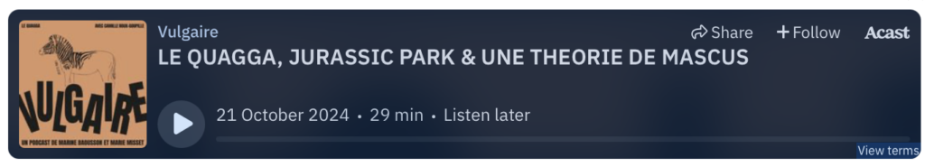 Pour le découvrir, je vous propose d’écouter ce super épisode du podcast Vulgaire, où je suis interviewée par les fantastiques Marine Baousson et Marie Misset. Quel titre ! Une excellente manière d’entré dans les histoires du quagga…